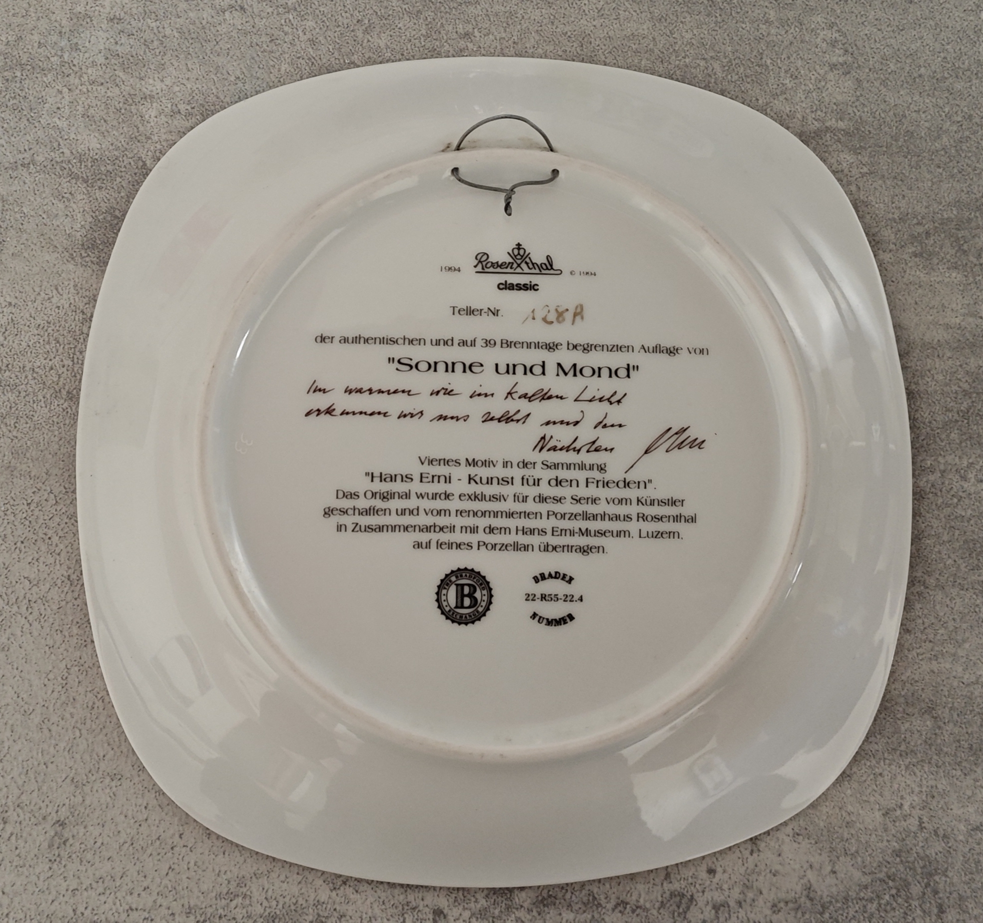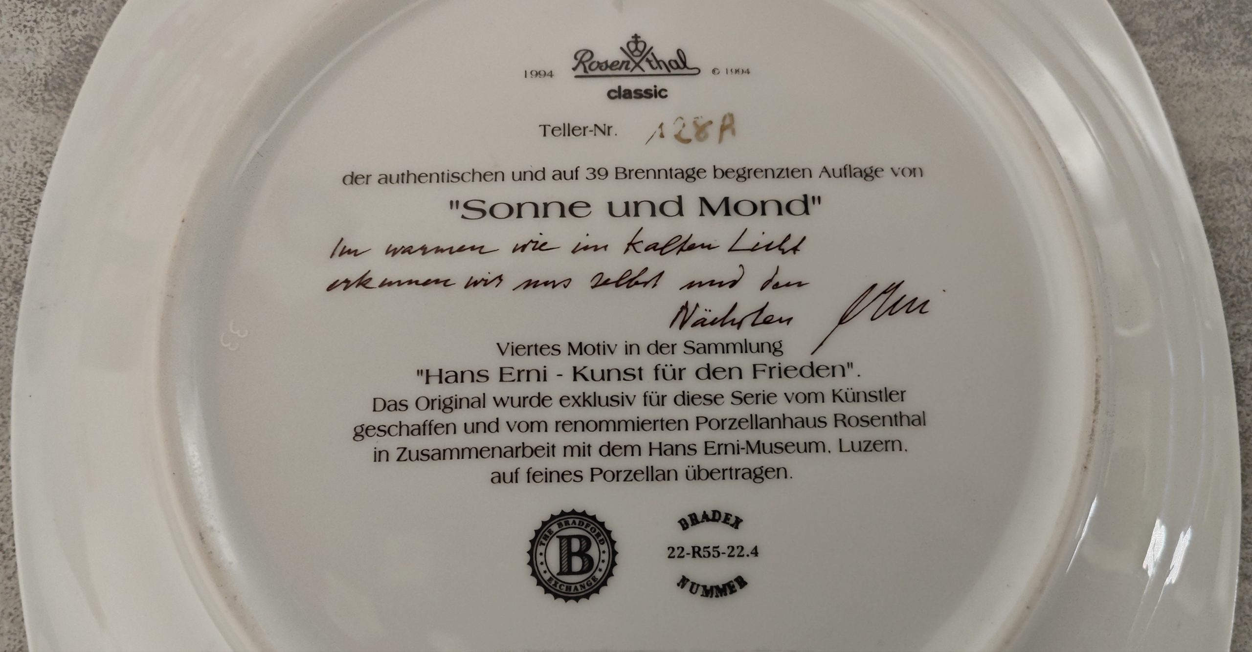 Cette pièce d’art, dont la référence est « Teller-Nr. 128A », est le quatrième motif de la prestigieuse collection « Hans Erni – Kunst für den Frieden » (L’art pour la paix).