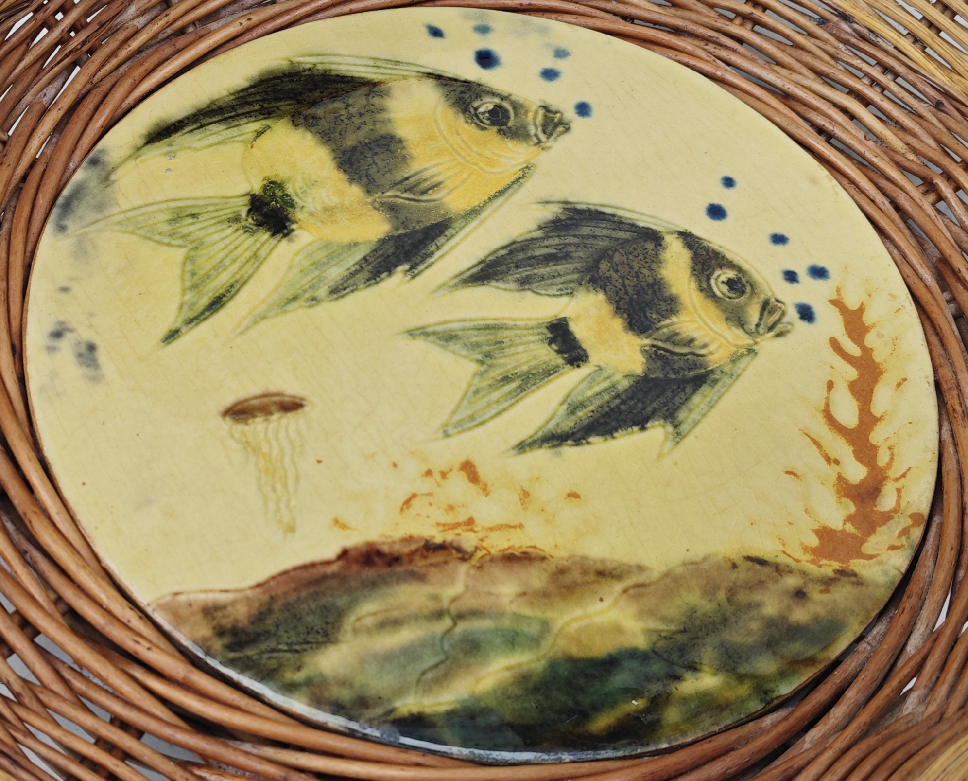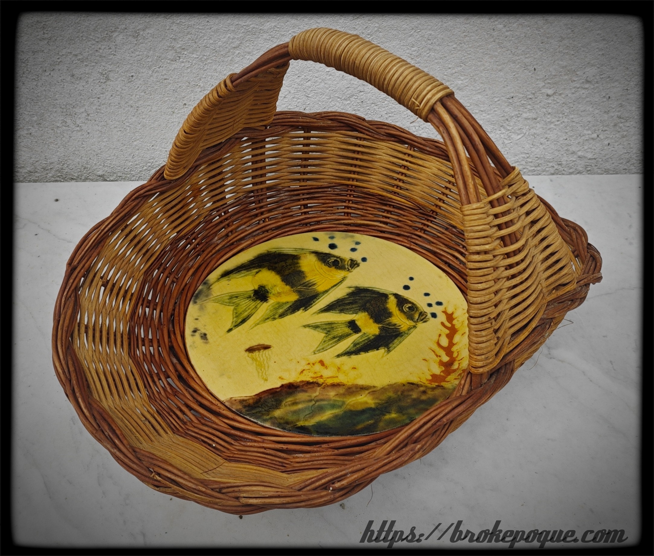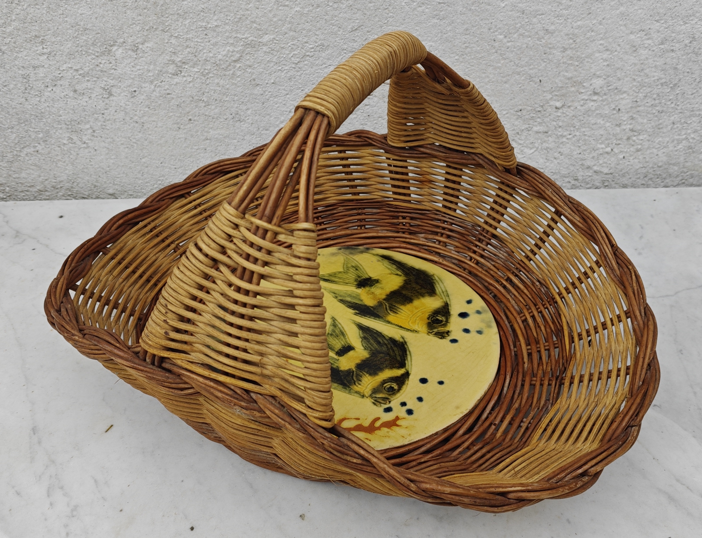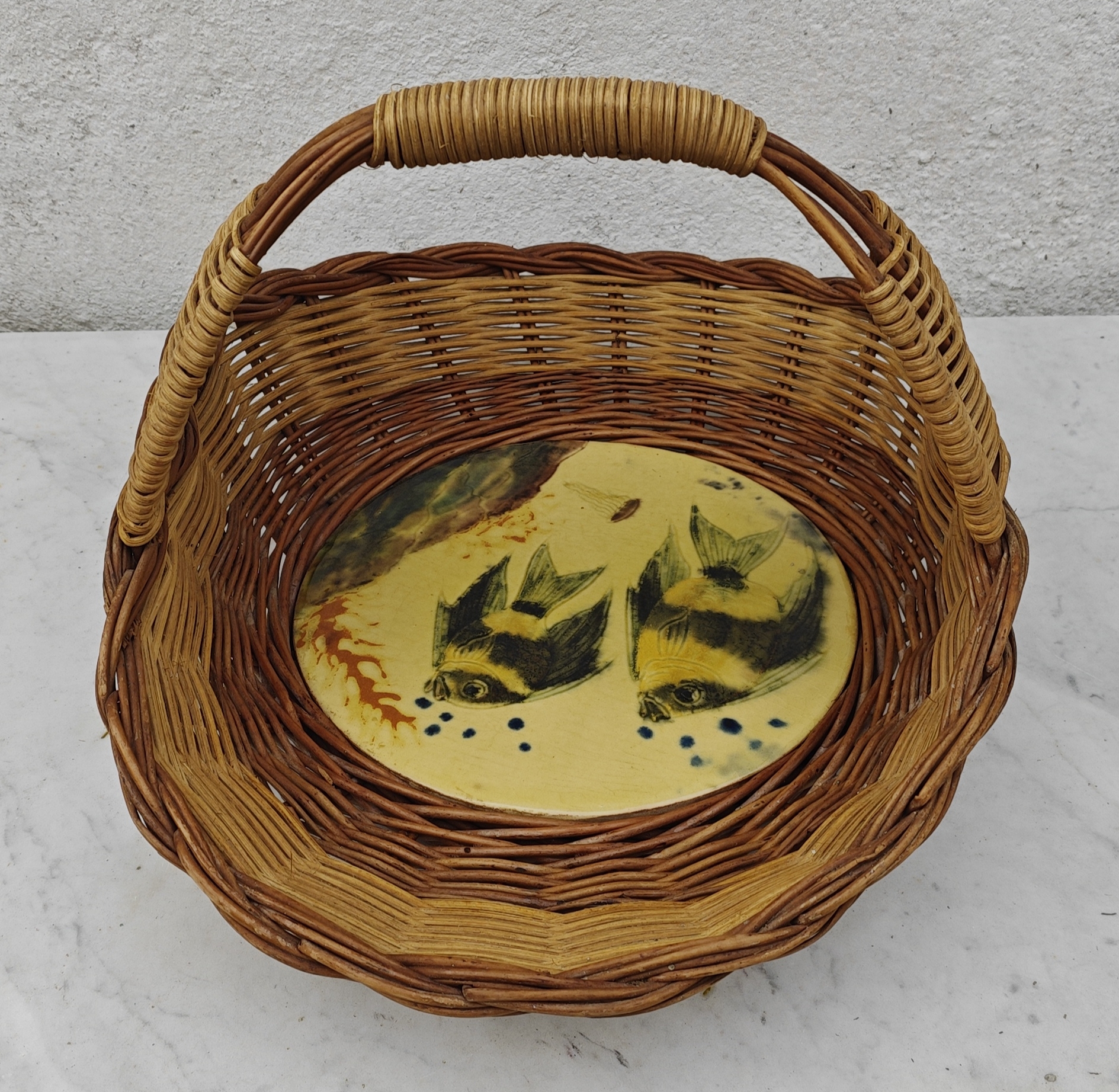 Panier vintage osier et céramique décor poissons